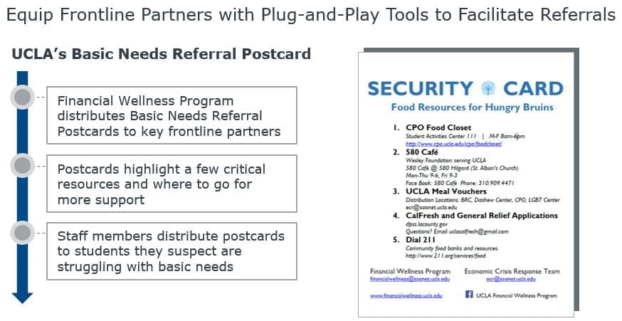 UCLA uses Basic Needs Referral Postcards to make it as easy as possible for staff to make referrals. The cards include key information about resources for hungry students and how they can reach out for support. The cards are distributed to frontline partners in residence life, financial aid, the center for international students, and special populations offices.