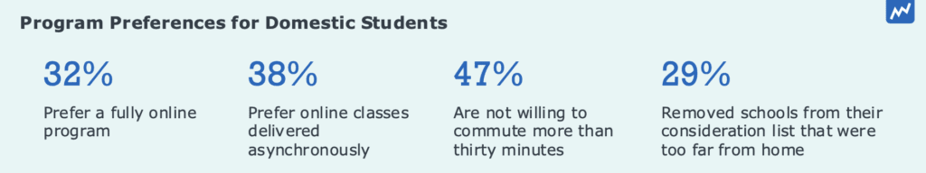 Domestic students approach their program search with specific questions, often leading to accelerated search timelines. Nearly half of surveyed domestic students research programs for less than six months, compared to just 31% of international students. After cost, domestic students are browsing school websites to understand program offerings. The majority of domestic students prefer hybrid classes, and those who prefer online classes (32%) want an asynchronous format. Most students considering in-person programs (22%) are unwilling to commute more than 30 minutes each way—nearly a third even remove schools from their consideration list if they are too far from home.