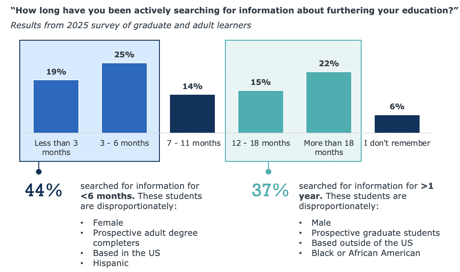 BD: When recruiting graduate students, enrollment teams need to account for a much longer and less linear decision process. While undergraduates tend to follow a predictable timeline, graduate students often move in and out of the funnel. On average, the recruitment window can be 24 to 36 months, so you need to engage them early, consistently, and over time.
