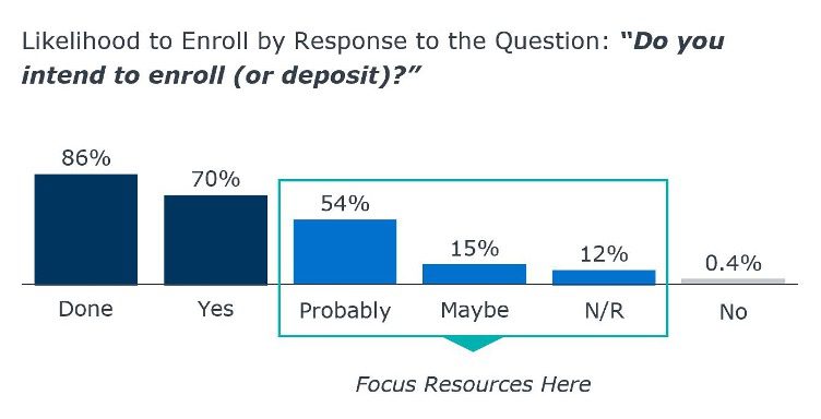 Students who say they do not plan to enroll at your institution rarely change their mind, so it’s often not worth focusing resources on changing their minds. Instead, ask those students why they didn’t choose your institution. The reasons students say they chose another institution—perhaps a more competitive financial aid package elsewhere, a shorter time-to-completion, or more promising student outcomes—can help inform changes to your recruitment strategy or even to your academic programs. And ask those students where they are enrolling instead to uncover competitors you may have previously overlooked.