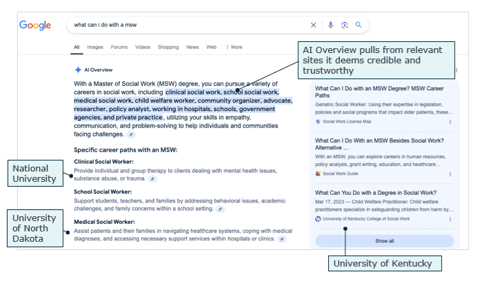 Strong keyword strategy still matters, but it’s no longer enough on its own. Today, optimizing your content strategy means ensuring every page—especially program and enrollment-focused ones—reflects how students naturally search. AI platforms prioritize conversational, specific queries that mirror how students naturally ask questions, such as “What are the best part-time master’s programs in data science that I can complete online while working full-time, and how much do they usually cost?’”