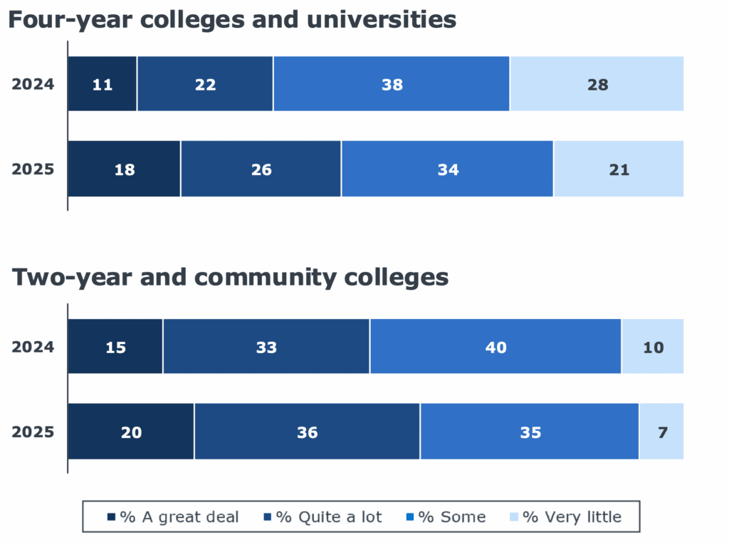 In a national environment where skepticism toward higher education has been high, community colleges emerge as a clear exception. Recent reporting shows that public confidence in higher education as a whole is rebounding, growing to 42% in 2025, up from 36% in 2023 and 2024. The share of adults who said they have very little or no confidence also dropped from 32% to 23%. These shifts represent a meaningful improvement in public sentiment.