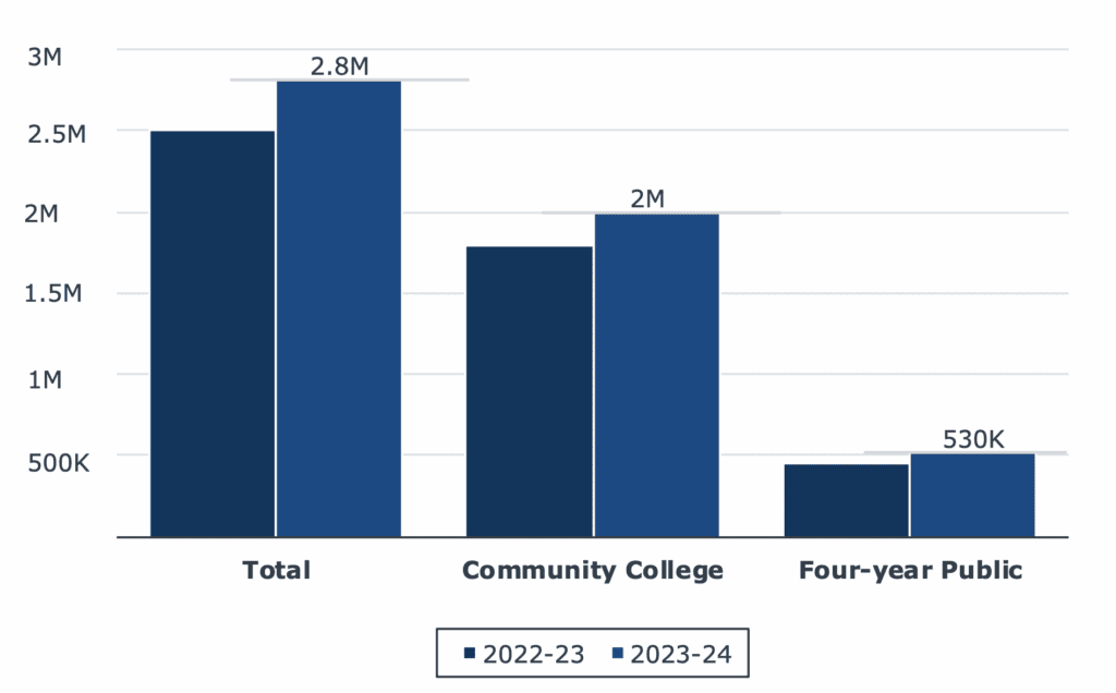 Dual enrollment has long served as an on-ramp for traditional-aged students, but the recent surge in participation represents a new and significant opportunity for community colleges. National data from the 2023–24 academic year show dual enrollment climbing rapidly, with 2.8 million high school students taking college courses, a 12.7% increase over the prior year. Community colleges remain the primary providers, enrolling 71% of all dual-enrolled students and growing their dual-enrollment participation by 11% in just one year.