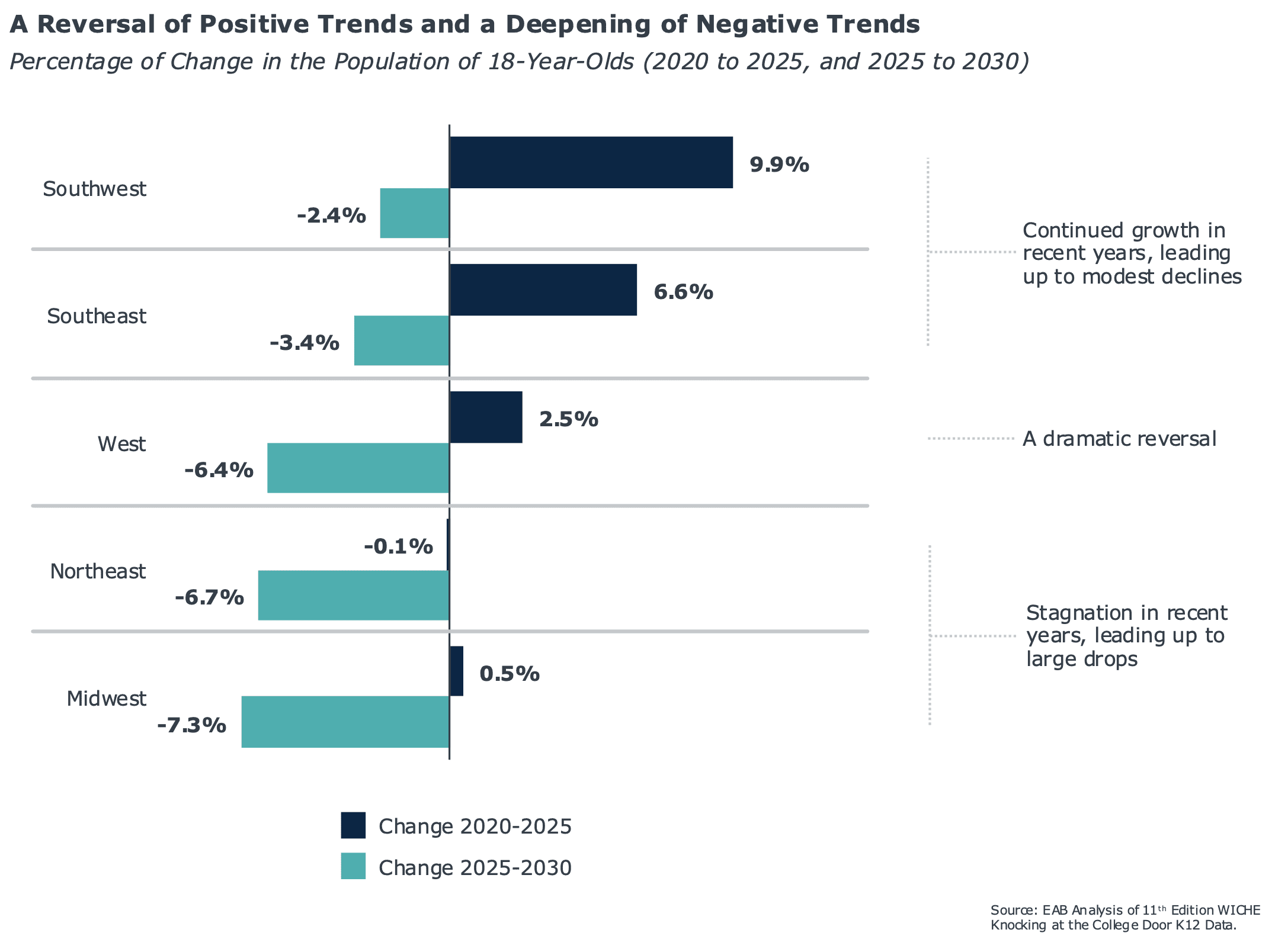 The deeper imbalance we now expect will reshape recruitment markets nationwide. Schools in faster-growing (or slower-declining) regions may temporarily enjoy demographic tailwinds, but they’ll also face mounting competition as institutions from other regions expand their recruiting efforts in the more stable states. Understanding where your institution sits in the new interregional dynamic is increasingly essential for enrollment strategy.