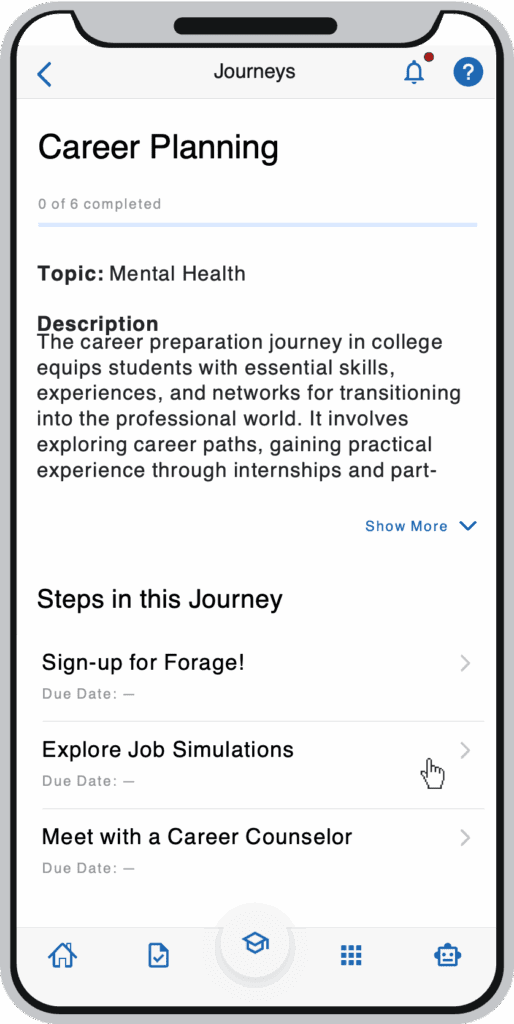 Early exposure matters, but structure makes it stick. Using Navigate360 Journeys, institutions can ensure career exploration is intentional and equitable rather than optional. Journeys organize steps and action items into a single guided pathway for students that staff can assign, monitor, and manage. So, students know what to do next, and teams can monitor progress across shared milestones.