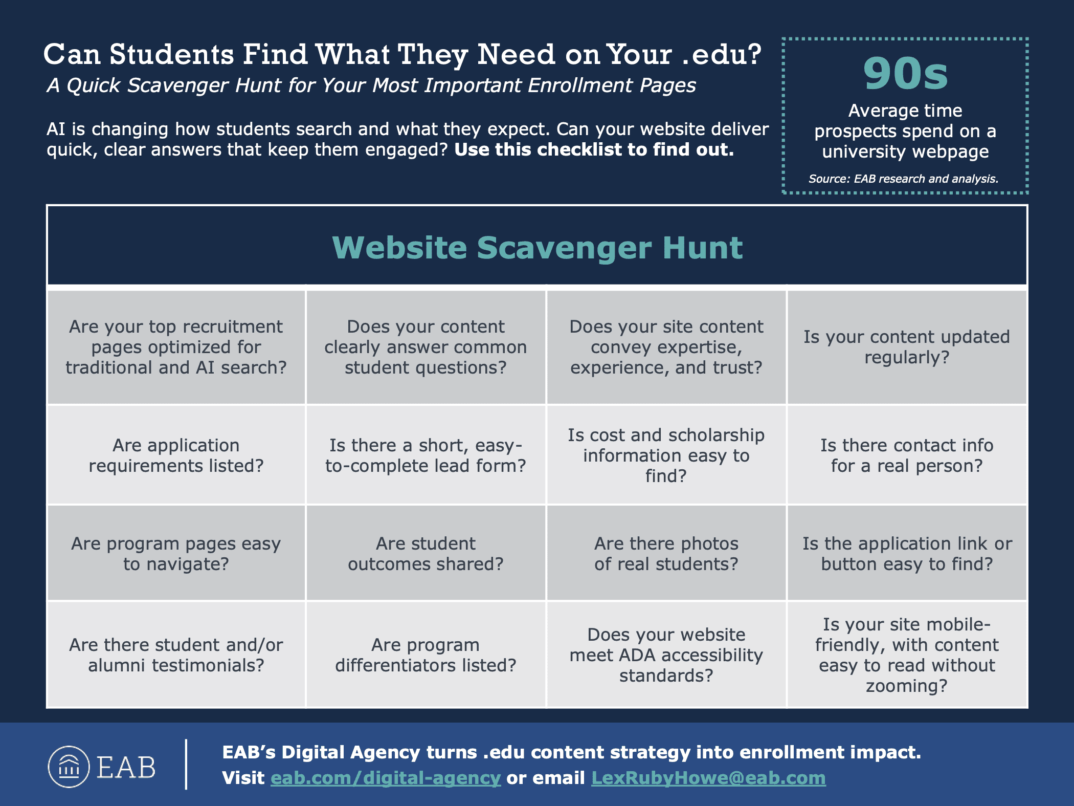 AI is changing how students search and what they expect from your .edu. Use this quick diagnostic to see whether your key enrollment pages are discoverable in AI and traditional search—and deliver the clarity, credibility, and accessibility students need to move forward.