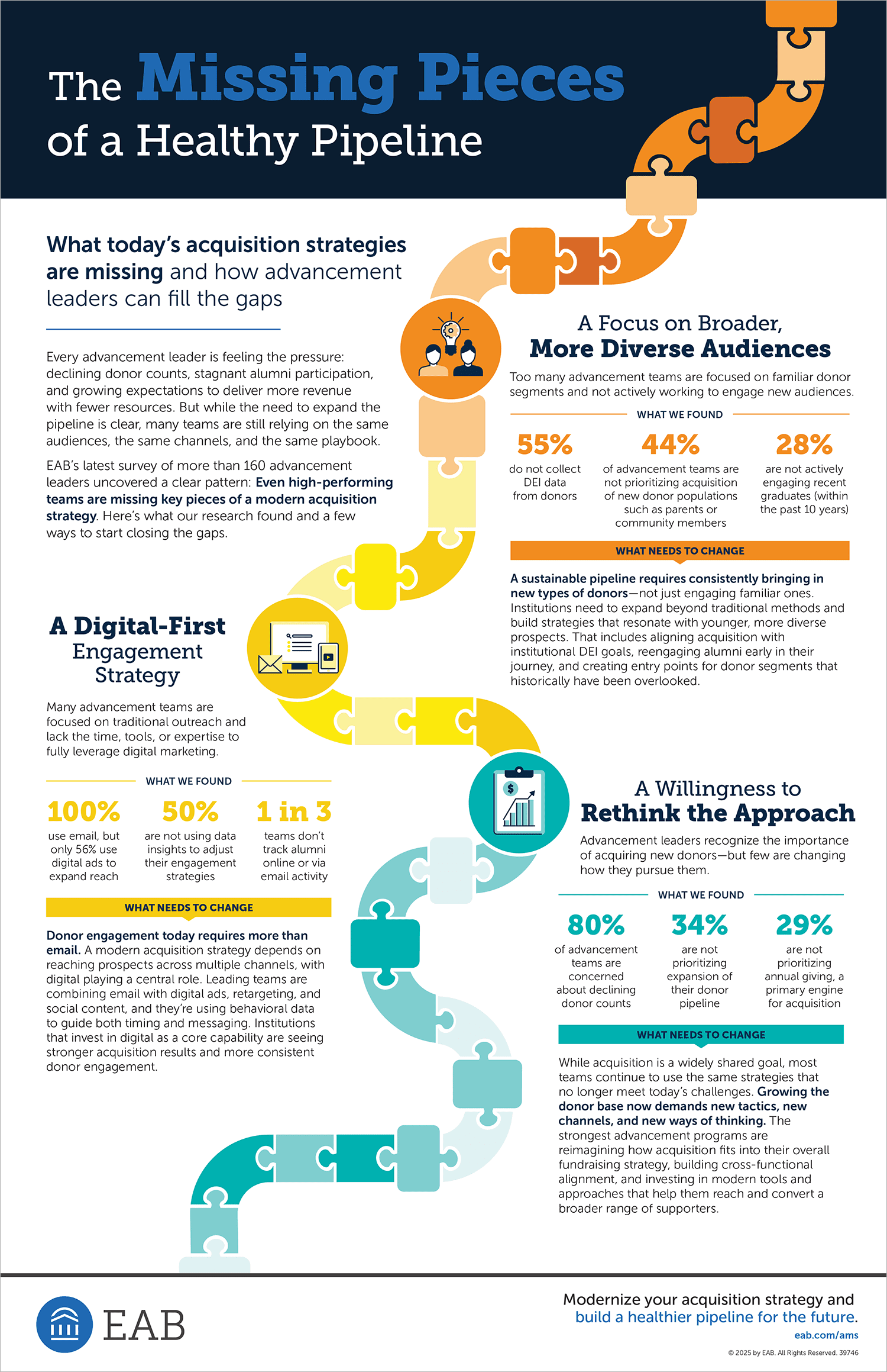 EAB’s latest survey of more than 160 advancement leaders uncovered a clear pattern: Even high-performing teams are missing key pieces of a modern acquisition strategy. Here’s what our research found and a few ways to start closing the gaps.