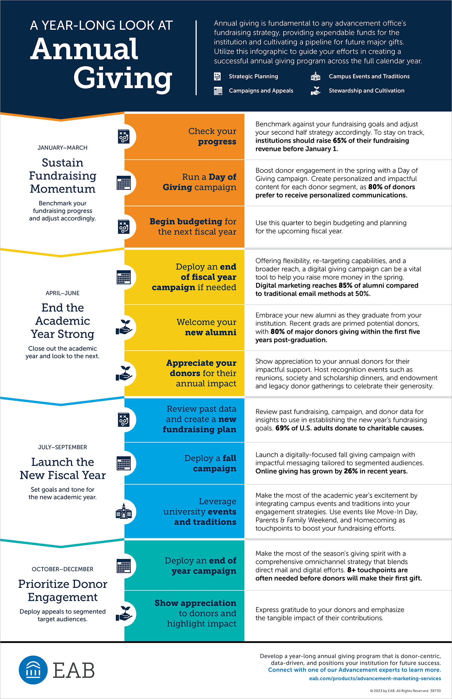 This infographic provides a clear, month-by-month view of how successful teams structure annual giving across the full calendar year. It highlights key moments for planning, campaigns, stewardship, and engagement, helping teams stay on pace and avoid last-minute scrambles.