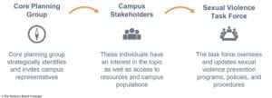 Individuals who represent a variety of stakeholder groups on campus are strategically identified and invited to join the sexual violence task force. A core planning group sets the task force agenda and work plan and has the final say in decision making.