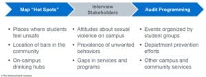 In order to effectively address sexual violence, the task force must understand the current state on campus. The task force should map out campus “hot spots” where assaults are most likely to occur. Conducting interviews with campus constituents can reveal attitudes and behaviors in regards to sexual violence that are prevalent on campus. Lastly, an audit of existing prevention programming can identify duplicative efforts and gaps in training.