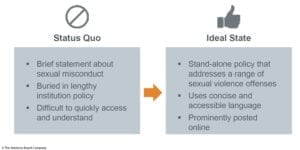 Sexual violence policies accurately reflect the realities of students’ experiences on campus. These policies, procedures, and resources are easily accessible.