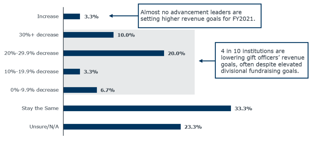 Exacerbating the situation, advancement leaders anticipate that COVID-19 will continue posing a challenge to fundraising across FY2021. They have expressed fear that expectations from presidents and boards are unrealistic given the economic realities facing many donors. Across the sector, advancement leaders are asking what goals are reasonable for them to set for their teams, and which metrics to track to help them get there amidst a new landscape.