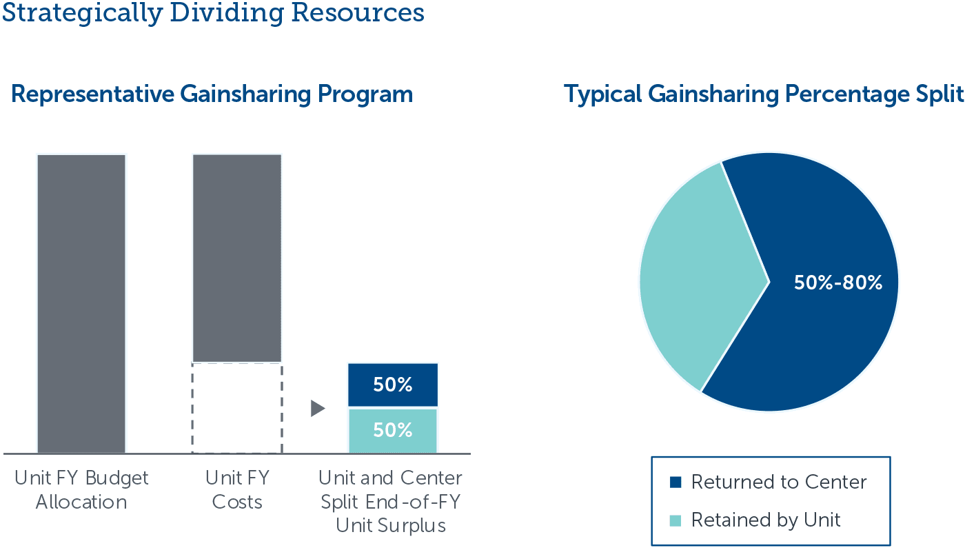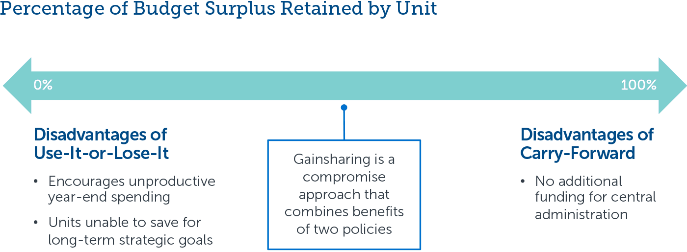 Higher education business leaders can use gainsharing agreements to incentivize more prudent spending and grow central strategic reserves. Under these agreements, units split any budget surpluses with central administration. This mitigates perverse incentives for units to either amass unnecessarily large reserves or squander every remaining budget dollar at year-end.