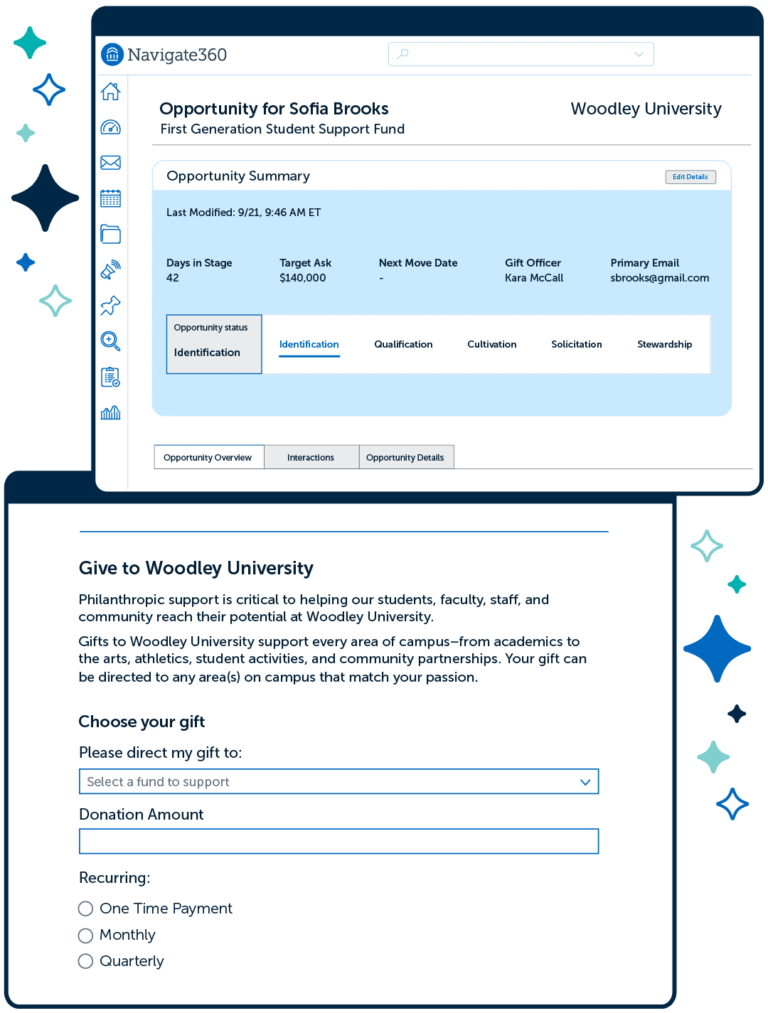 The Navigate360 Advancement CRM for Community Colleges is the only advancement solution built for community colleges, bringing donor and alumni data together in one modern, intuitive platform. With seamless integration into EAB’s leading student success platform, the Navigate360 Advancement CRM connects siloed data to create rich profiles of alumni’s college experiences. Responsible, user-centric AI automates routine tasks and gives your staff the capacity to scale personalized outreach.