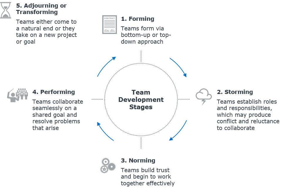 After teams are assembled and trained, they continue to develop over time. The SciTS literature references numerous development frameworks that could be applied to research teams. One of the most widely cited examples is Bruce Tuckman’s 1965 Model of Group Development (Bennett, Gadlin, and Marchand 2018). This model presents five stages through which teams progress: (1) forming, (2) storming, (3) norming, (4) performing, and (5) adjourning or transforming. It can be used to assess a research team’s development and maturity
