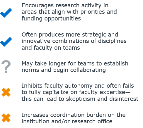 Institutional leaders and/or the research office actively recruits handpicked faculty members to participate on a research team. These teams are often formed in response to a specific funding opportunity or an institutional priority area.