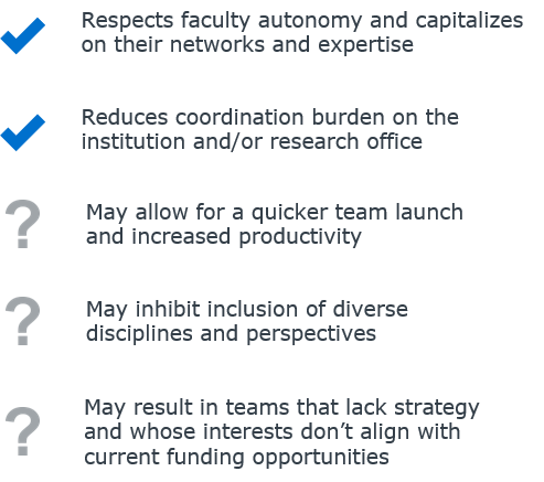 Faculty self-assemble to form a collaborative research team without input or direction from the research office and/or institutional leadership. These teams may or may not be formed in response to a specific funding opportunity.
